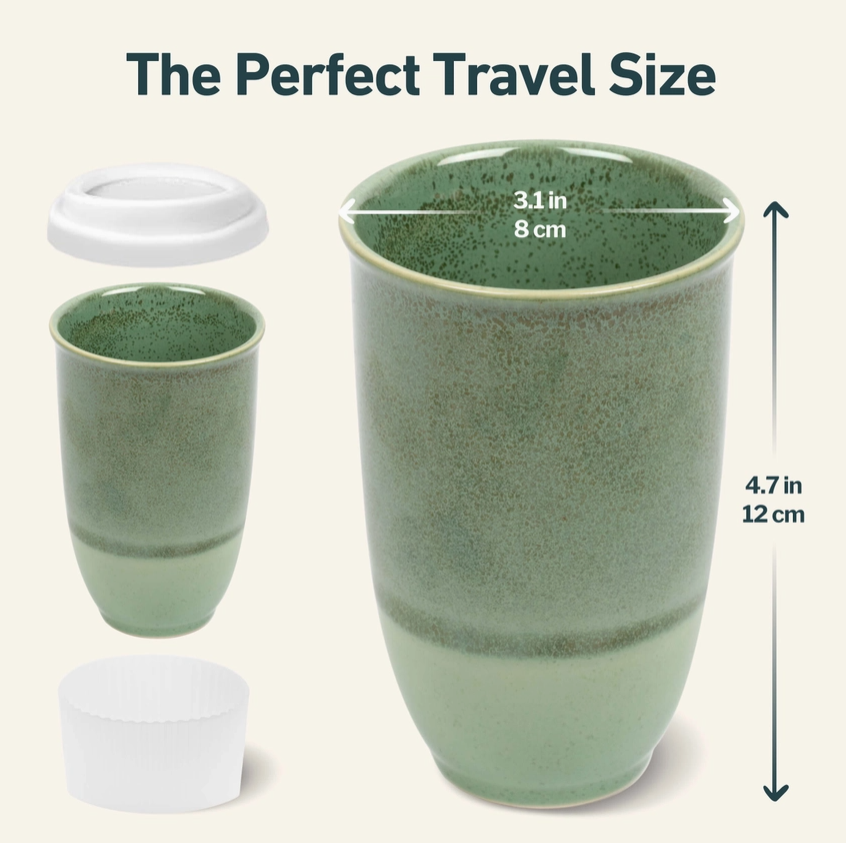Bring the calming beauty of the forest to your coffee routine with the Emerald 12oz Ceramic Travel Mug. Its dual-tone green glaze is inspired by natural canopies, with each handcrafted mug featuring a one-of-a-kind finish. Made from premium stoneware ceramic, this eco-friendly cup delivers a pure taste with no metallic aftertaste. The BPA-free silicone lid and matching heat sleeve provide a secure, comfortable grip—perfect for commuting or relaxing at home. • Capacity: 12oz / 355ml • Size: 4.7 x 3.1 in / 12 x 8cm • BPA-free silicone lid and sleeve included • Fits standard vehicle cup holders • Compatible with most home coffee machines • Microwave and dishwasher safe • A thoughtful Q4 gift for eco-conscious coffee lovers Make every sip a mindful moment with this durable and stylish reusable mug.