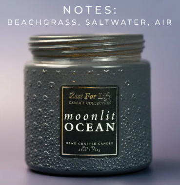 Zest For Life Candle Collection • Double-wick, textured glass jar with matching lid • 28oz. Paraffin Wax • Burn Time: 130 hours • Dimensions: 4.25"W x 4.75"H • Fragrance Description: Beachgrass - Saltwater - Air.