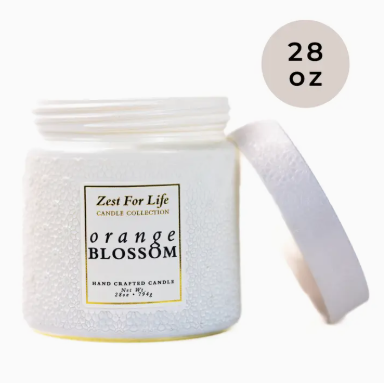 Zest For Life Candle Collection • Double-wick, textured glass jar with matching lid • 28oz. Paraffin Wax • Burn Time: 130 hours • Dimensions: 4.25"W x 4.75"H • Fragrance Description: Orange - Jasmine - Cedar