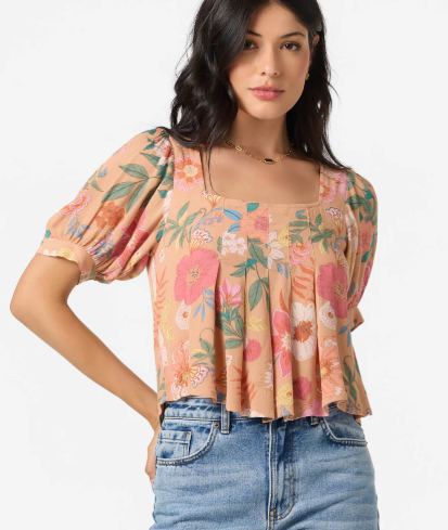 Airy and effortlessly sunlit, this woven puff-sleeve top features delicate pleats, a breezy back tie, and a playful coastal print, made for days that drift with the tides.