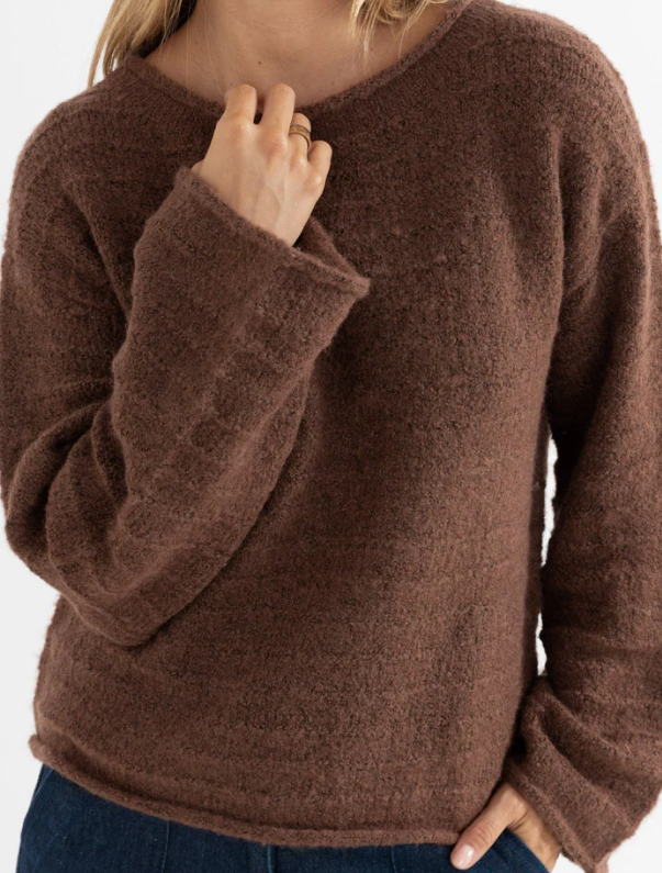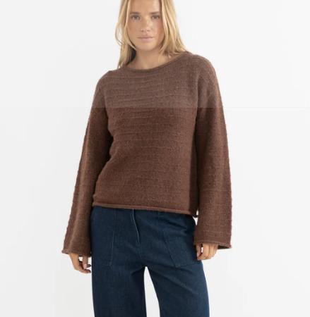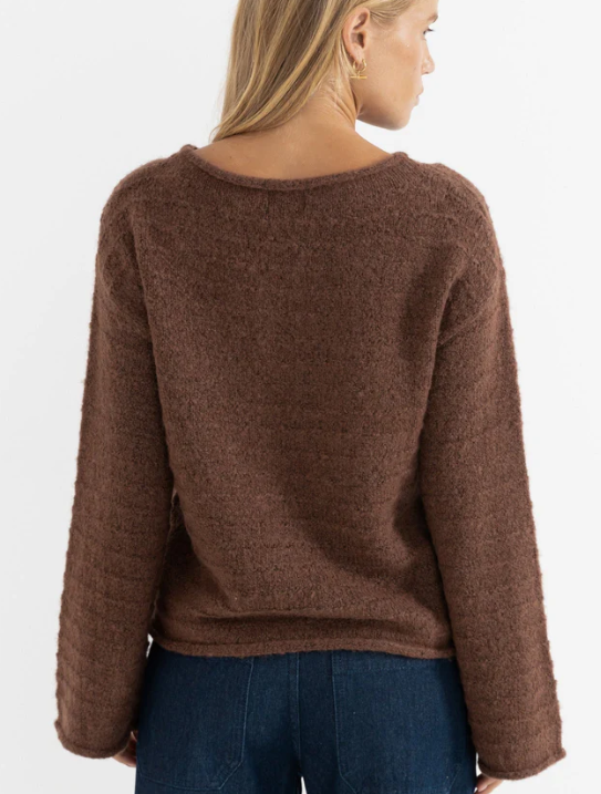 The Baklava knit sweater in chocolate combines comfort and style with its wide sleeves and boat neckline. This relaxed piece features a lightweight open stitch layout, ideal for effortless layering.