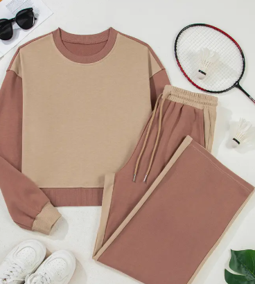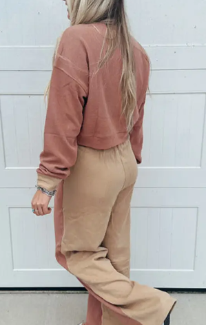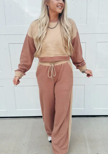The casual 2pcs set will be your new favor. Lounge set for women with a 2-tone color block look. Includes a long sleeve crop top and loose drawstring pants.