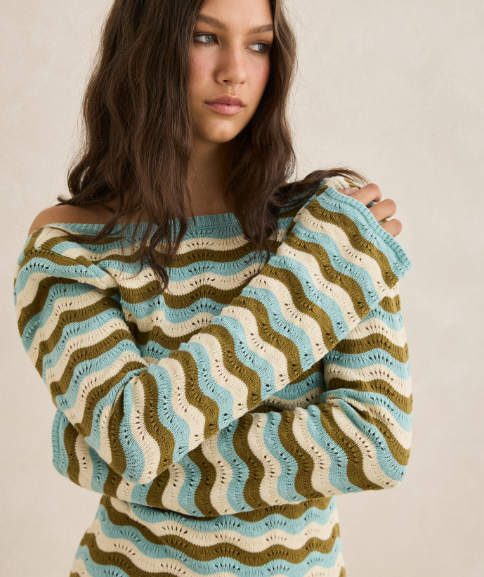A sun-drenched layer for life by the water, the Whispering Tides Knit Mini Dress in Blue features a low scoop back and slim fit. Designed to be worn over swim with ease.----Material60% Cotton 40% Acrylic---- Features Long Sleeve Slim Fit Dress With Low Scoop Back, Overswim Style Multi Colour Wave Stripe With Cotton Blend Yarns---- Size & Fit Bust - 31” Waist - 24” Hips - 34.5” height - 5'9.