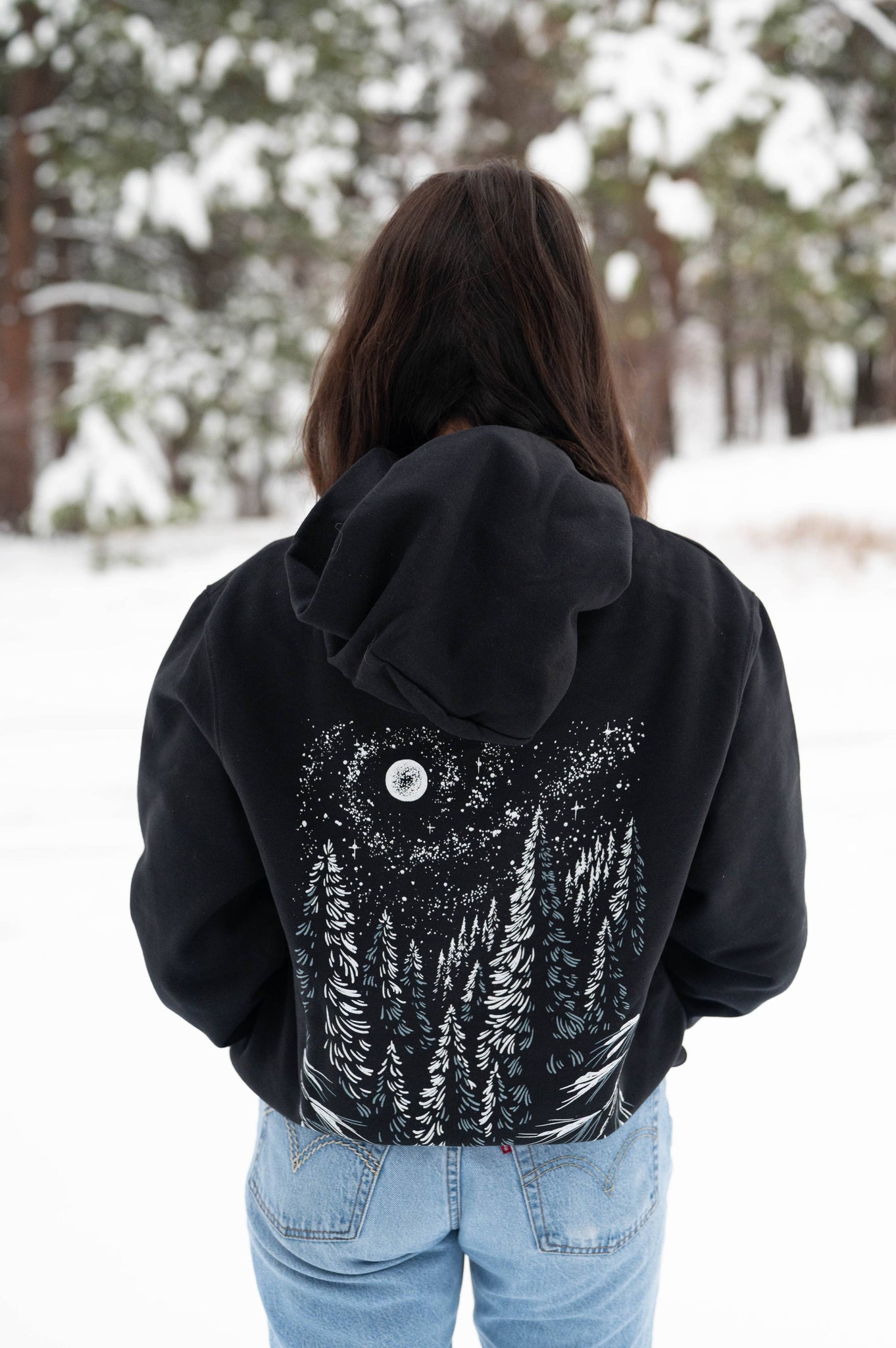 Cozy up in the calm of the woods. This unisex black hoodie features a striking winter forest design, a minimalist nod to nature’s quiet beauty. Crafted from a soft, heavy -weight cotton-blend fleece, it offers the perfect balance of warmth and comfort for chilly days, campfire nights, or just lounging indoors.